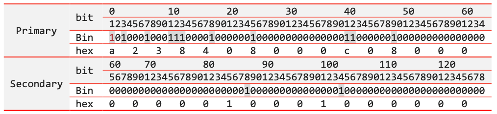 Given fields 0, 1, 3, 7, 11, 12, 13, 18, 25, 41, 42, 49, 88 and 104 present in a message. As key 88 and 104 will not fit in primary bitmap, both primary and secondary bitmap must be used.